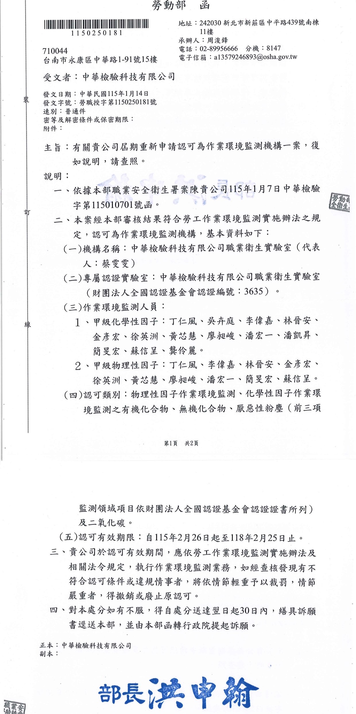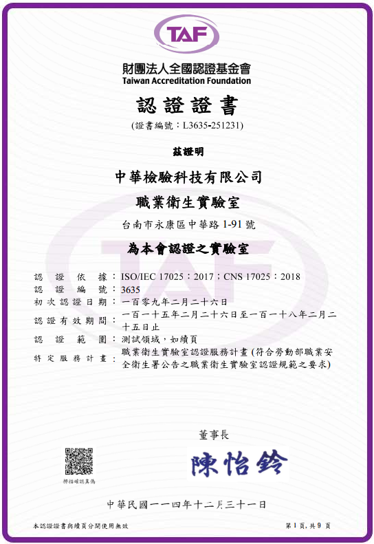 財團法人全國認證基金會 ➤於109年度初次通過,有效期至118年2月25日。 勞動部 函 ➤於109年度初次通過,有效期至118年2月25日。 ➤勞動部認可的合法作業環境監測機構,擁有專屬認證實驗室品質有保證,非委託他家實驗室(監測機構跟實驗室名稱不一致)。